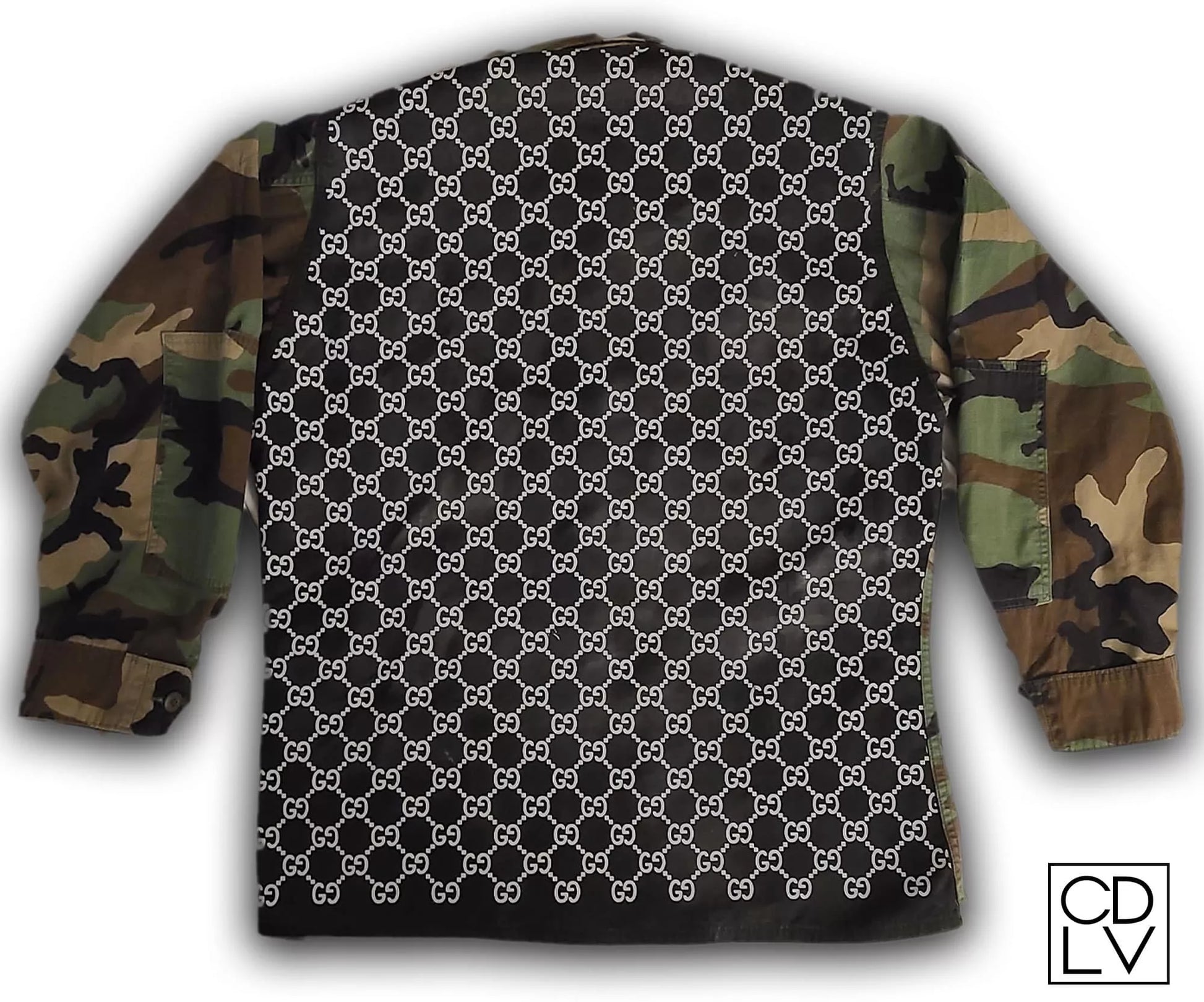 Elevate your outerwear collection with the CDLV Gucci 3M Reflective Monogram-Inspired Vintage Military Jacket, a striking fusion of luxury-inspired design and urban fashion. This one-of-a-kind piece features a reflective 3M monogram pattern inspired by Gucci’s iconic aesthetic, blending high-end sophistication with the rugged appeal of vintage military wear.